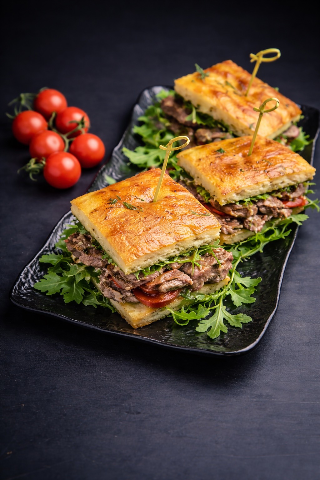 foccacia, pulpa de vita*, rucola, rosii uscate, sos tartar
