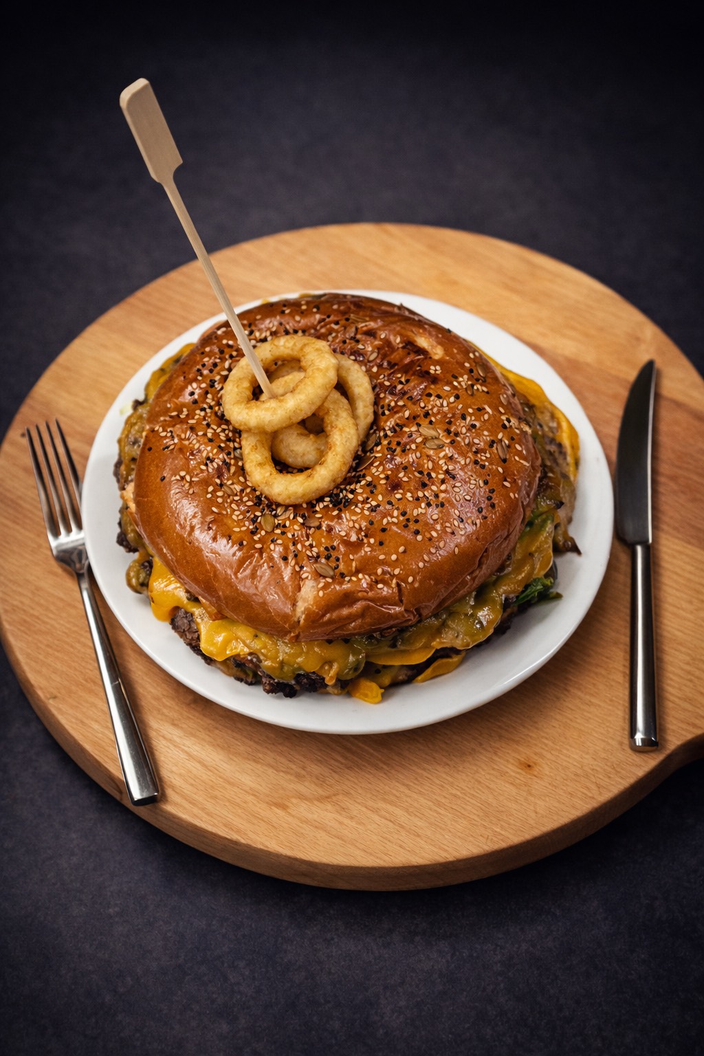pulpa de vita*, chifla gigant, cartofi dippers, ceapa, salata verde, rosie, branza cheddar, castraveti murati,ulei de floarea soarelui, sos worchestershire, mustar, ou, sos burger, inele de ceapa*