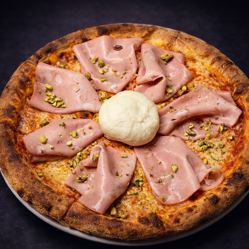 mortadella, mozzarella, burrata, fistic, suc de rosii, aluat de pizza