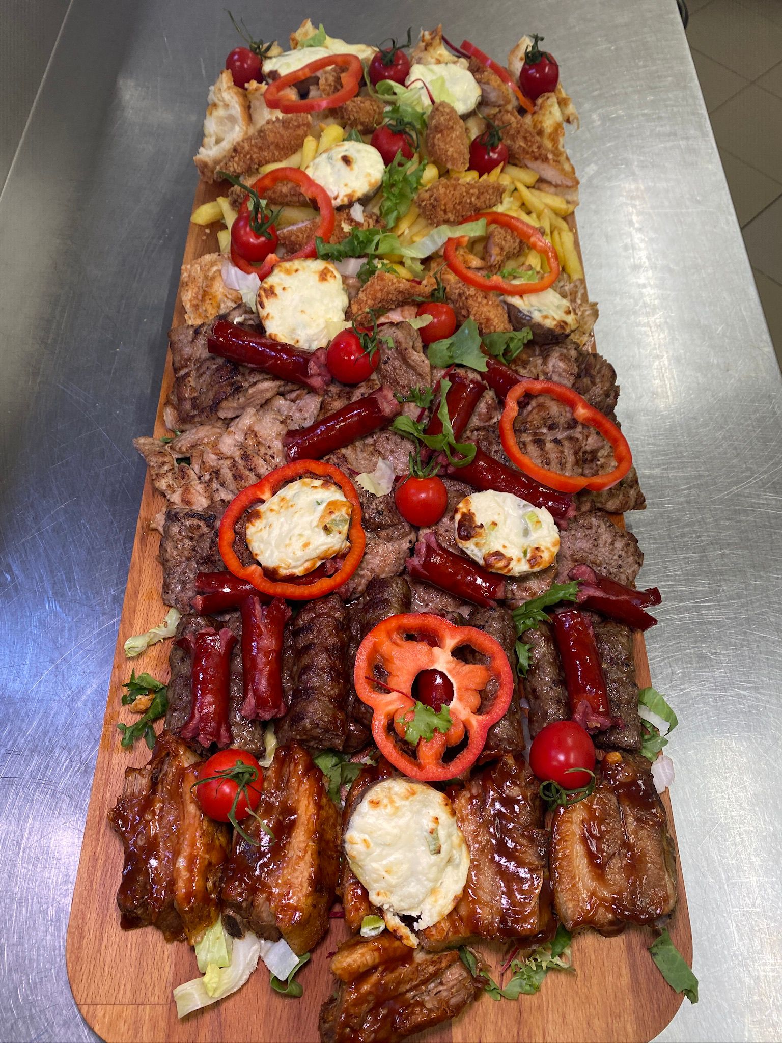 Ceafa de porc, mititei, carnaciori, crispy de pui, costite de porc, cartofi prajiti, cartofi copti cu branza, mujdei, garlic bread, sos barbeque