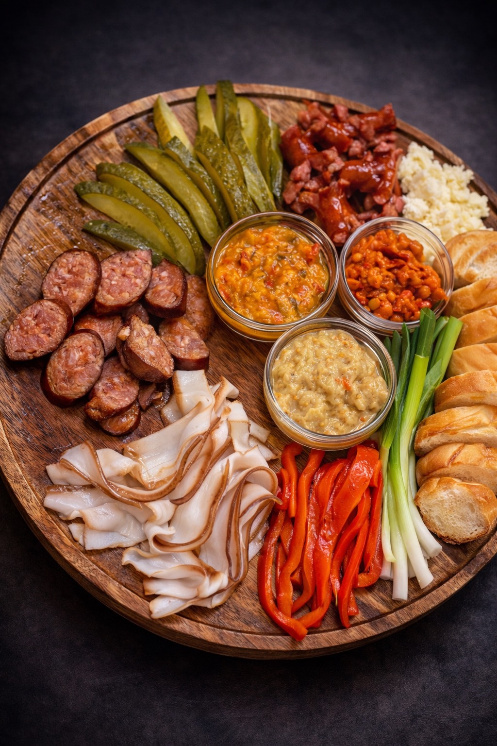 zacusca cu fasole, zacusca cu vinete, salata de vinete, slanina, cabanos,jumere, branza de burduf, ceapa verde, castraveti murati, mustar